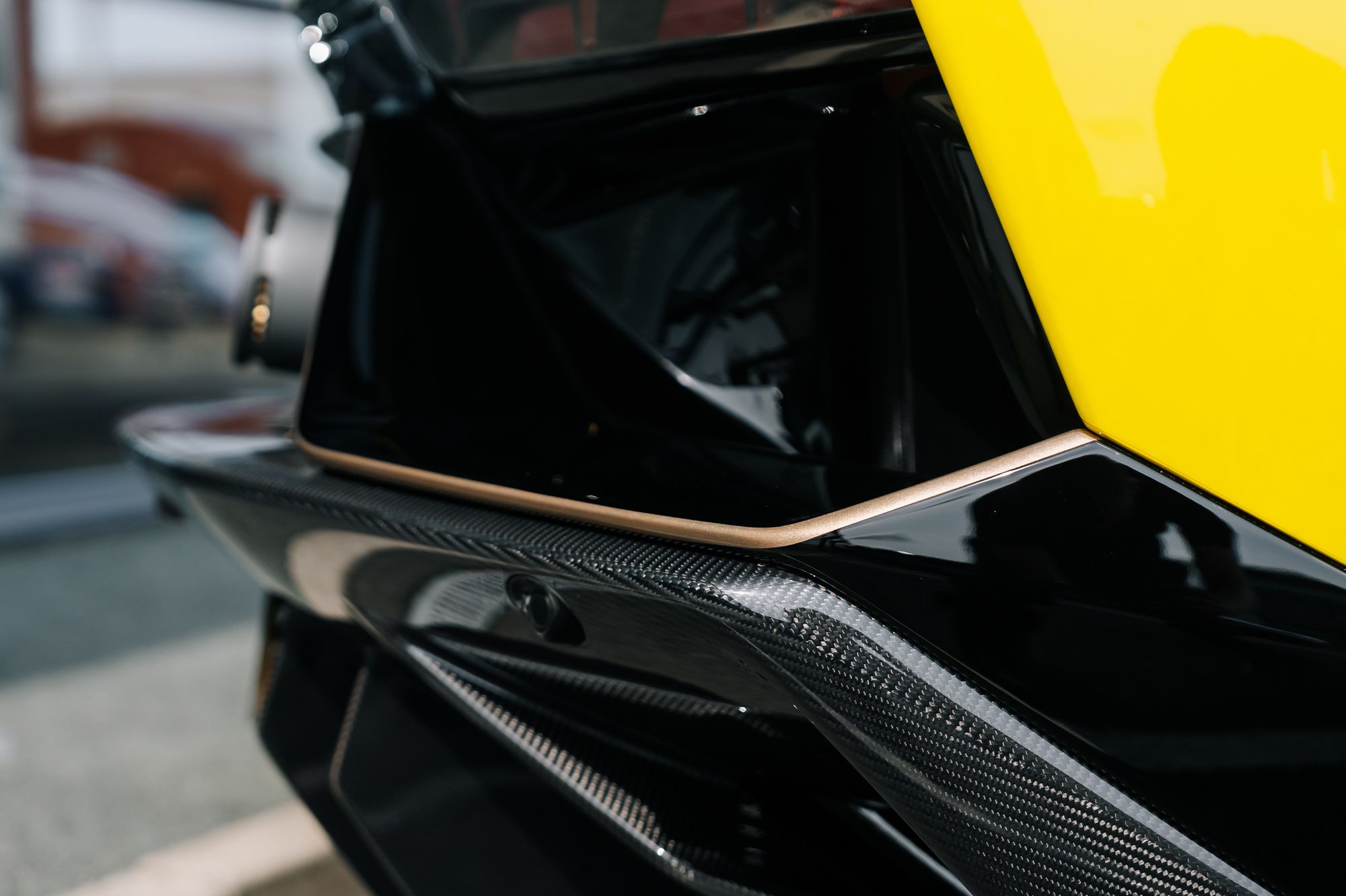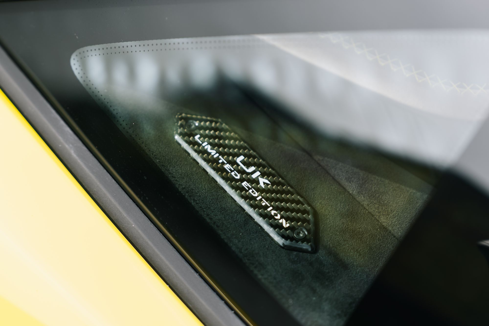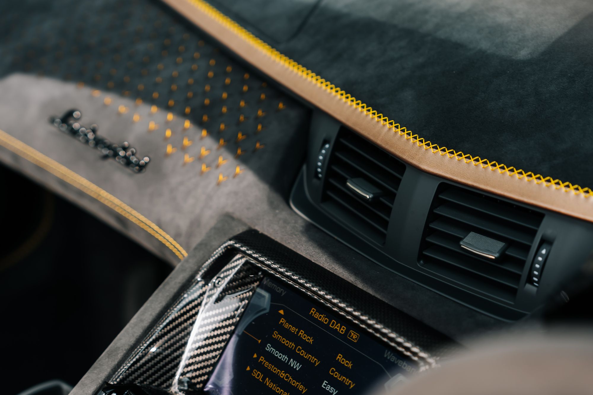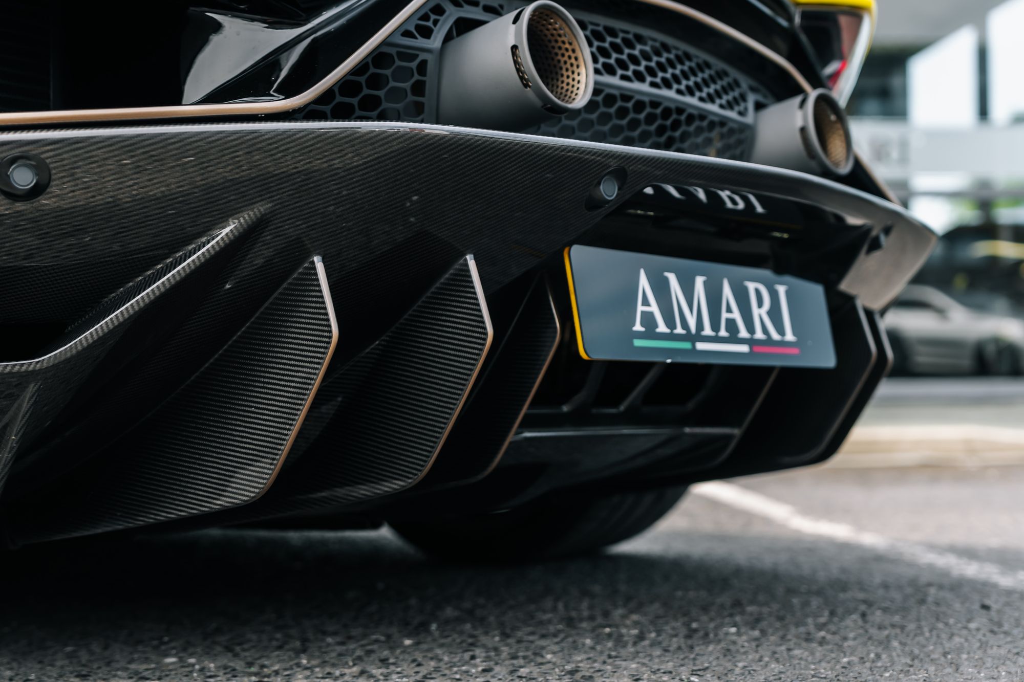 The vehicle boasts an impressive specification, including front and rear parking sensors with a rear view camera, a travel package, and Giallo Taurus stitching. It also features the Visibility and Light package, yellow brake calipers, shiny carbon fibre C-pillars air intakes and bonnet air outlets, a fixed air intake in shiny carbon fibre, and a removable hard top in shiny carbon fibre. The Ultimae Full Painted Livery in Bronzo adds an extra touch of exclusivity.