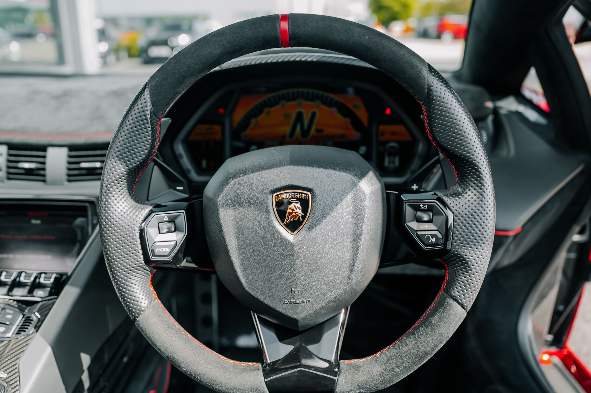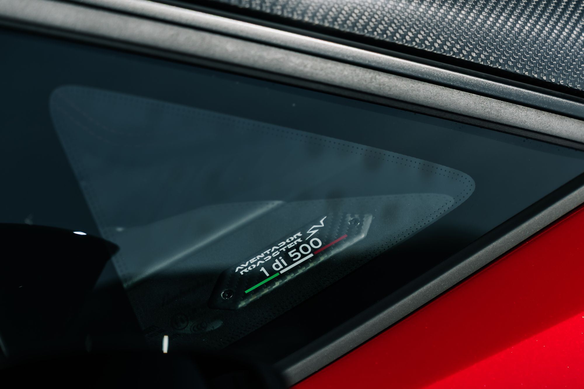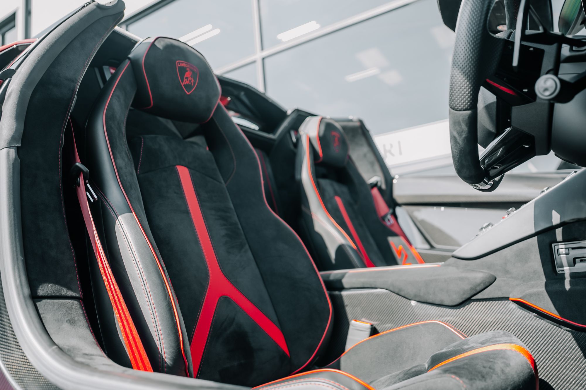 The interior is appointed in Nero Cosmus with Rosso Alala accents, featuring Ad Personam enhancements such as Rosso Alala seat belts, Super Veloce logo between the seats, and a glove box with thicker piping. The cabin is further enriched by carbon fibre elements, including the SV logo, footplate, and windscreen frame, all finished in gloss. Comfort features include fully electric and heated seats, a navigation and infotainment system, DAB tuner, and a rear-view camera.