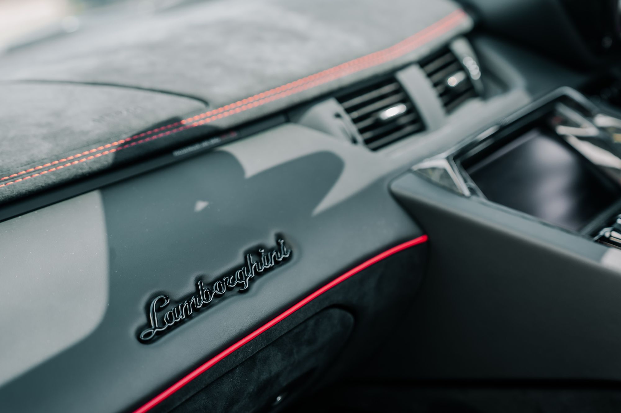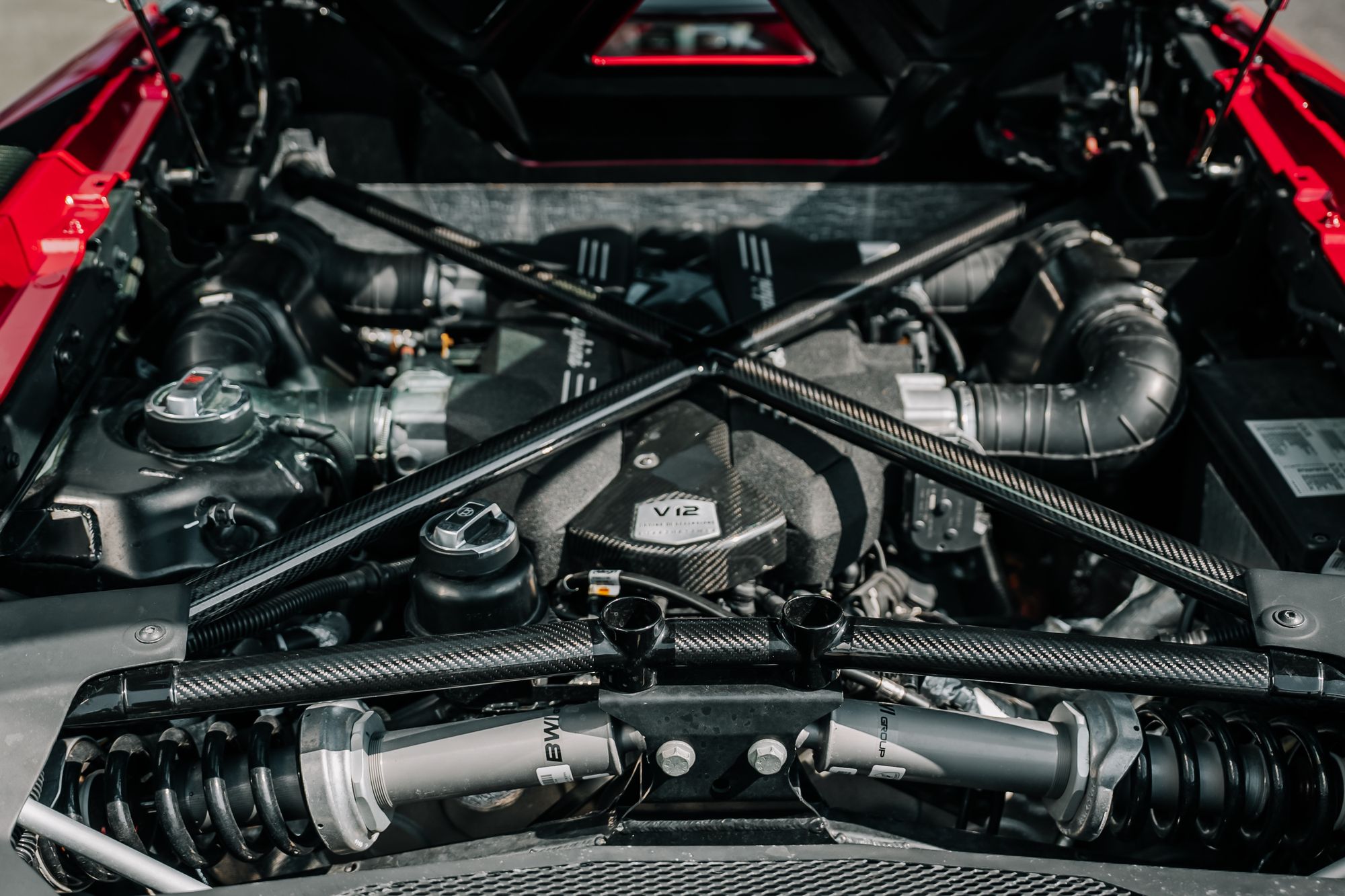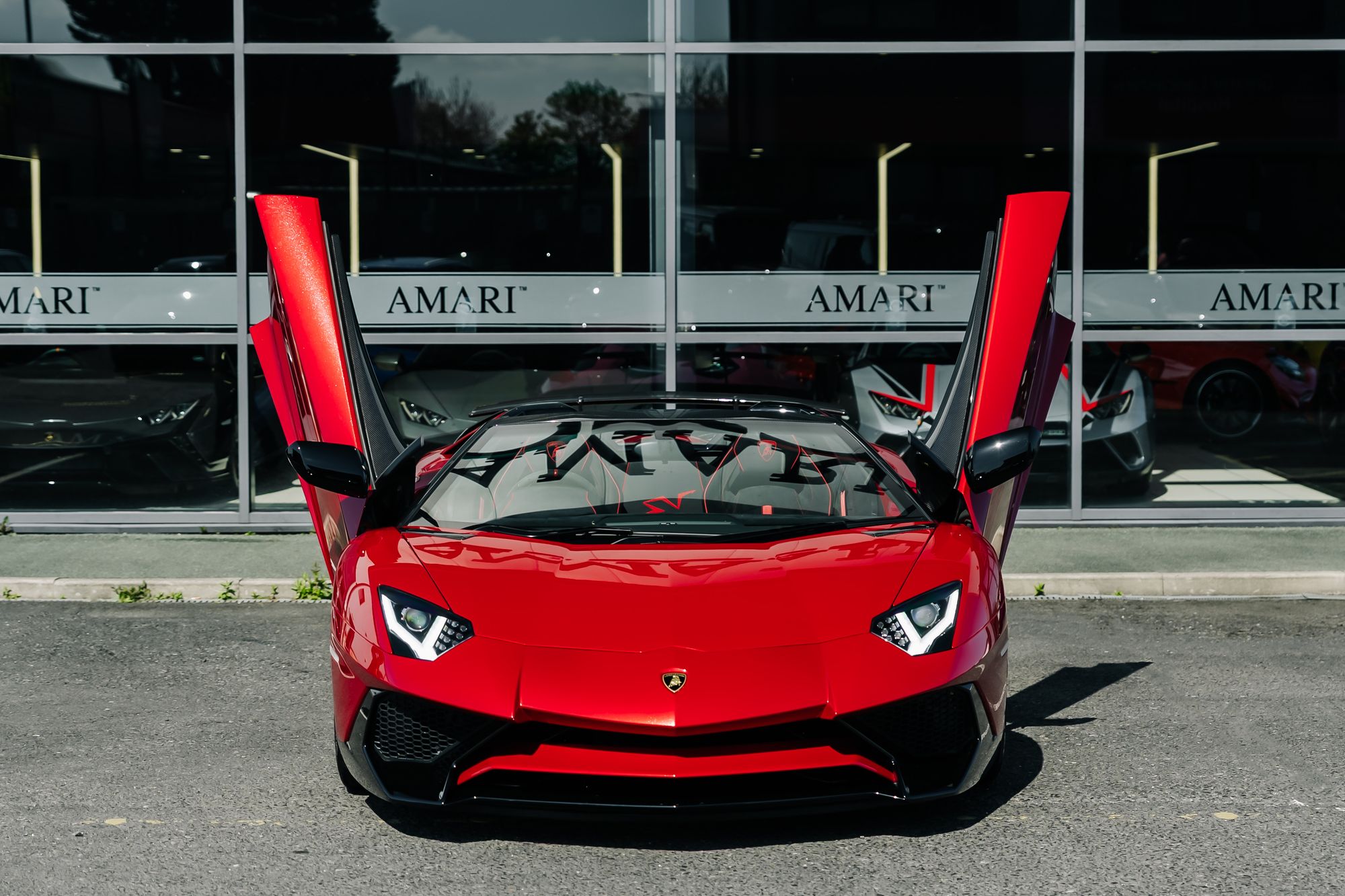 The interior is appointed in Nero Cosmus with Rosso Alala accents, featuring Ad Personam enhancements such as Rosso Alala seat belts, Super Veloce logo between the seats, and a glove box with thicker piping. The cabin is further enriched by carbon fibre elements, including the SV logo, footplate, and windscreen frame, all finished in gloss. Comfort features include fully electric and heated seats, a navigation and infotainment system, DAB tuner, and a rear-view camera.