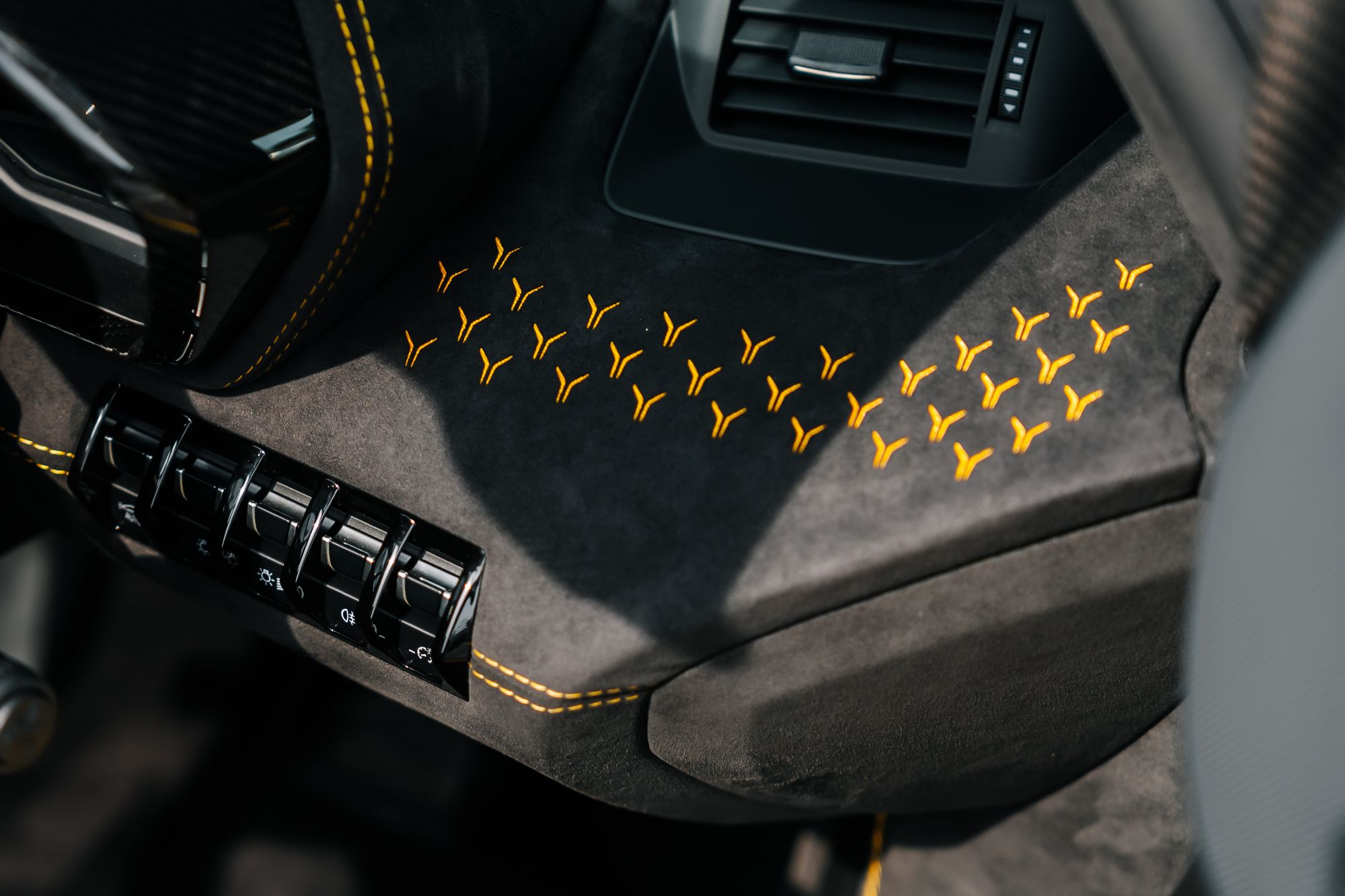 The vehicle boasts an impressive specification, including front and rear parking sensors with a rear view camera, a travel package, and Giallo Taurus stitching. It also features the Visibility and Light package, yellow brake calipers, shiny carbon fibre C-pillars air intakes and bonnet air outlets, a fixed air intake in shiny carbon fibre, and a removable hard top in shiny carbon fibre. The Ultimae Full Painted Livery in Bronzo adds an extra touch of exclusivity.