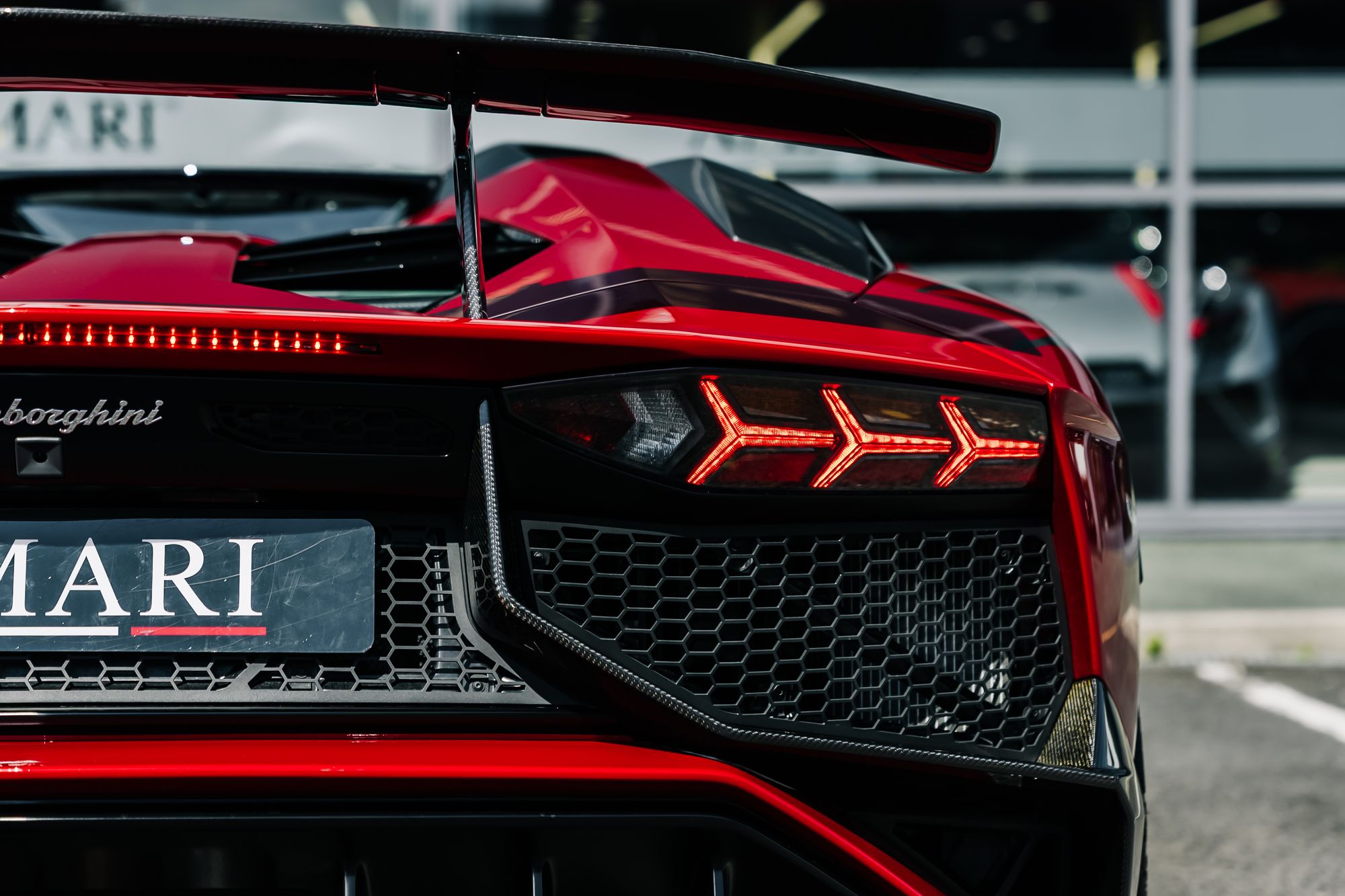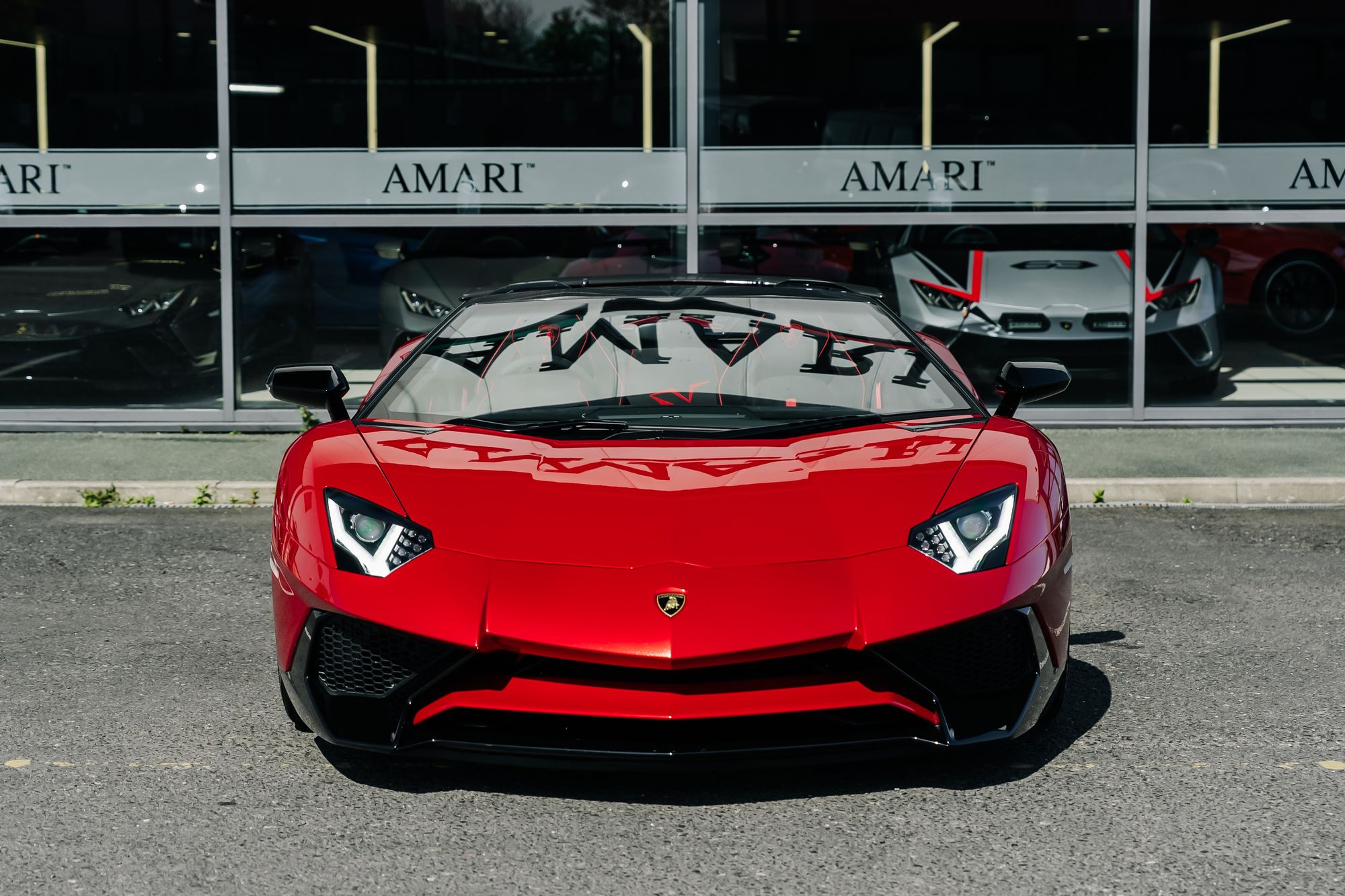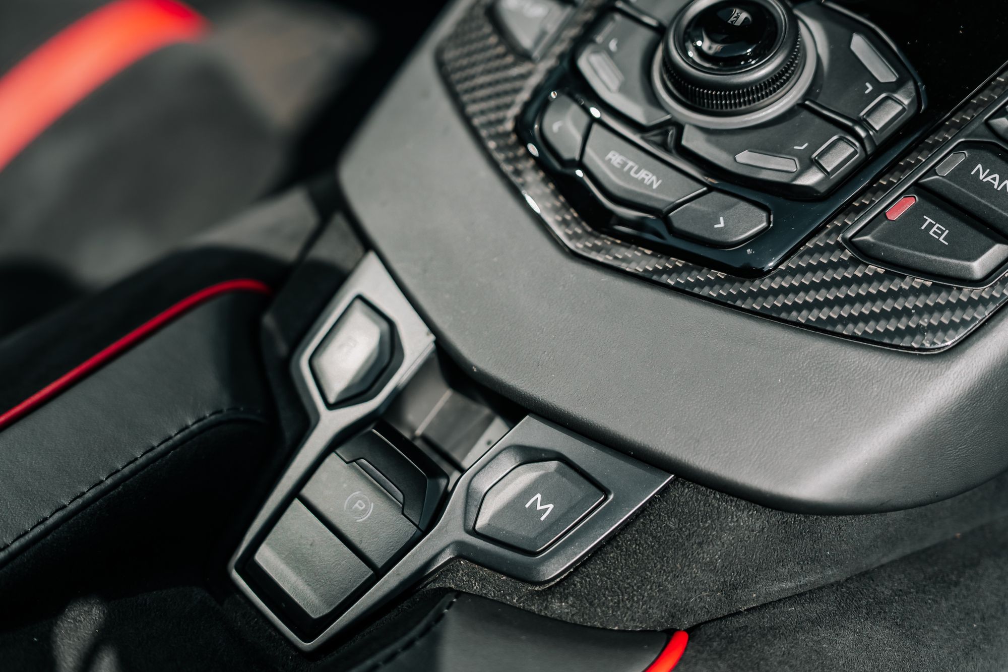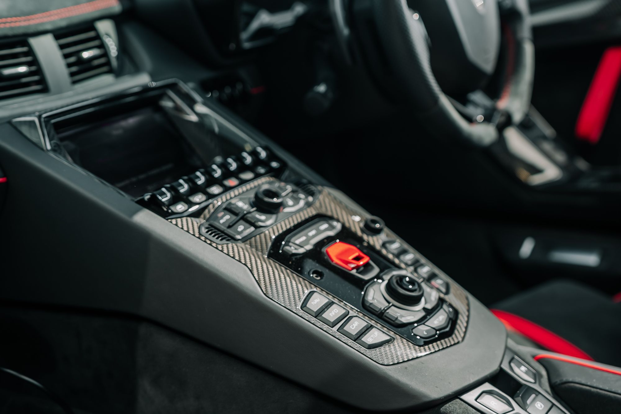 The interior is appointed in Nero Cosmus with Rosso Alala accents, featuring Ad Personam enhancements such as Rosso Alala seat belts, Super Veloce logo between the seats, and a glove box with thicker piping. The cabin is further enriched by carbon fibre elements, including the SV logo, footplate, and windscreen frame, all finished in gloss. Comfort features include fully electric and heated seats, a navigation and infotainment system, DAB tuner, and a rear-view camera.
